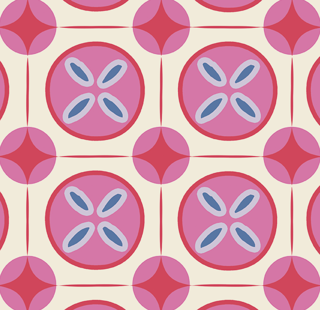 Design: A fun, Scandinavian geometric fabric in pink and blue design on a natural background. Also available in a teal blue.